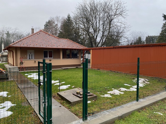 A telek összközműves, programozható automata locsolórendszerrel (fúrt kútról) működik.