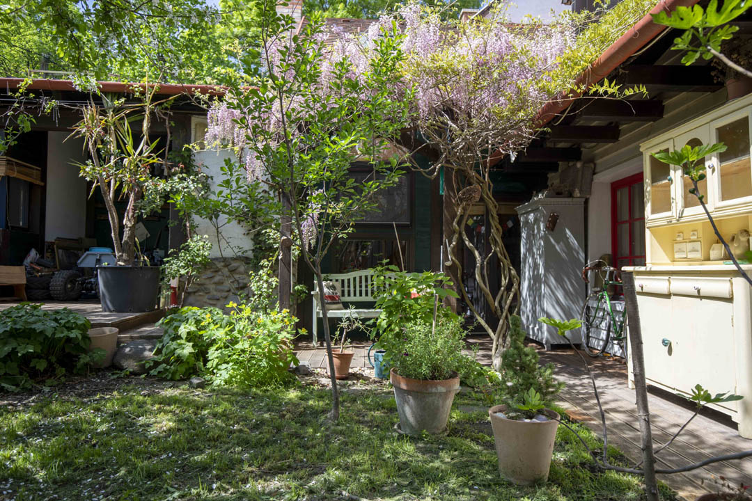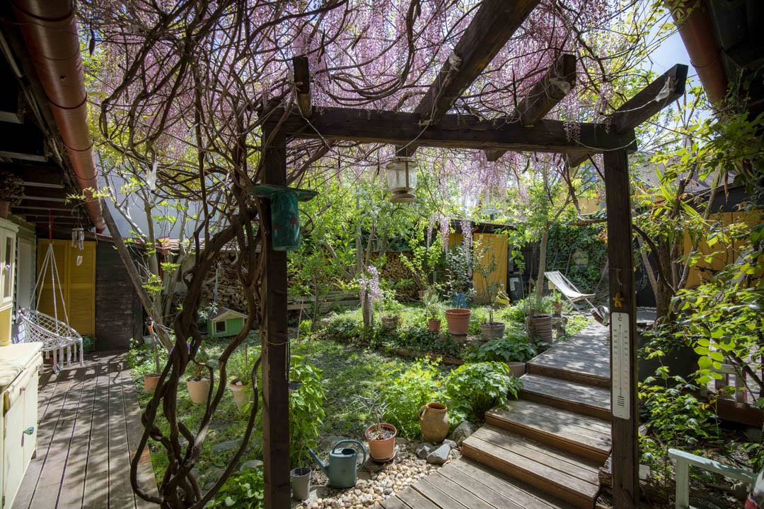 A kert intim, lila akáccal felfuttatva.