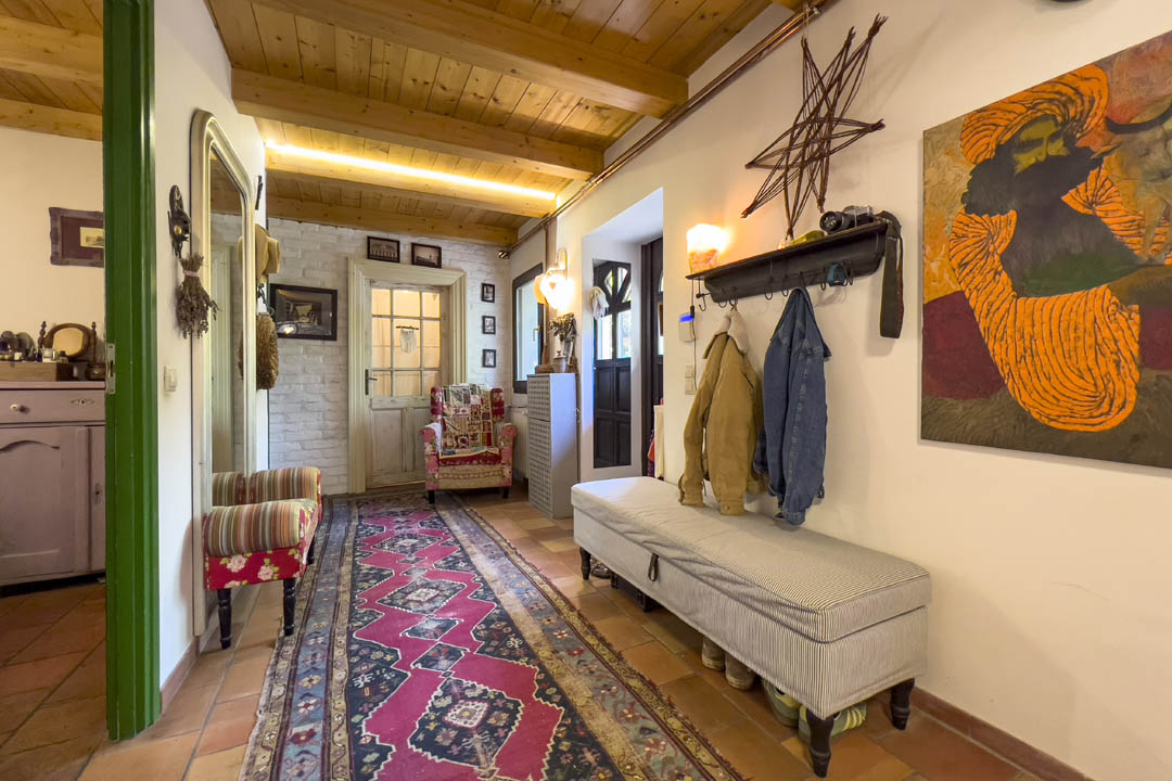 A házban nappali és ékező konyha mellett 4 szoba, 2 fürdőszoba, WC, mosókonyha/gardrób, kamra, műhely található.