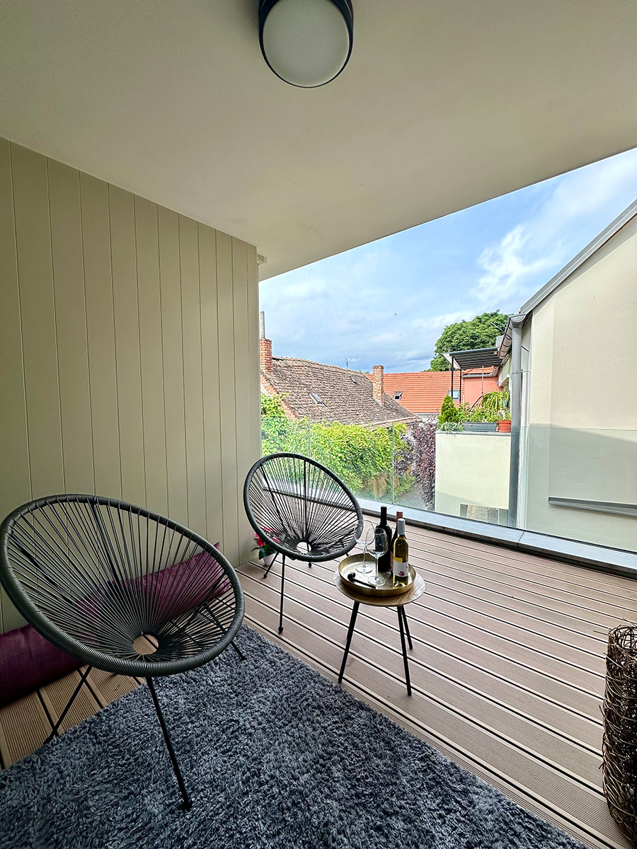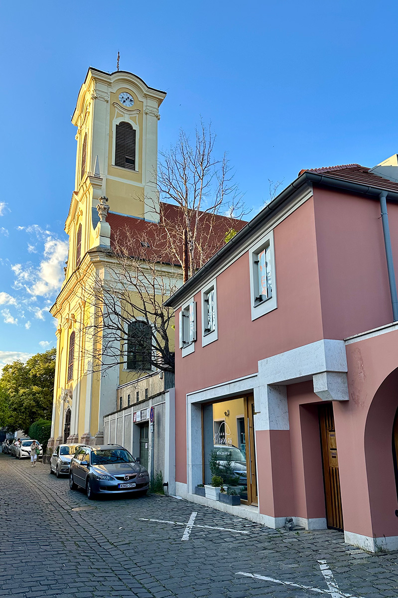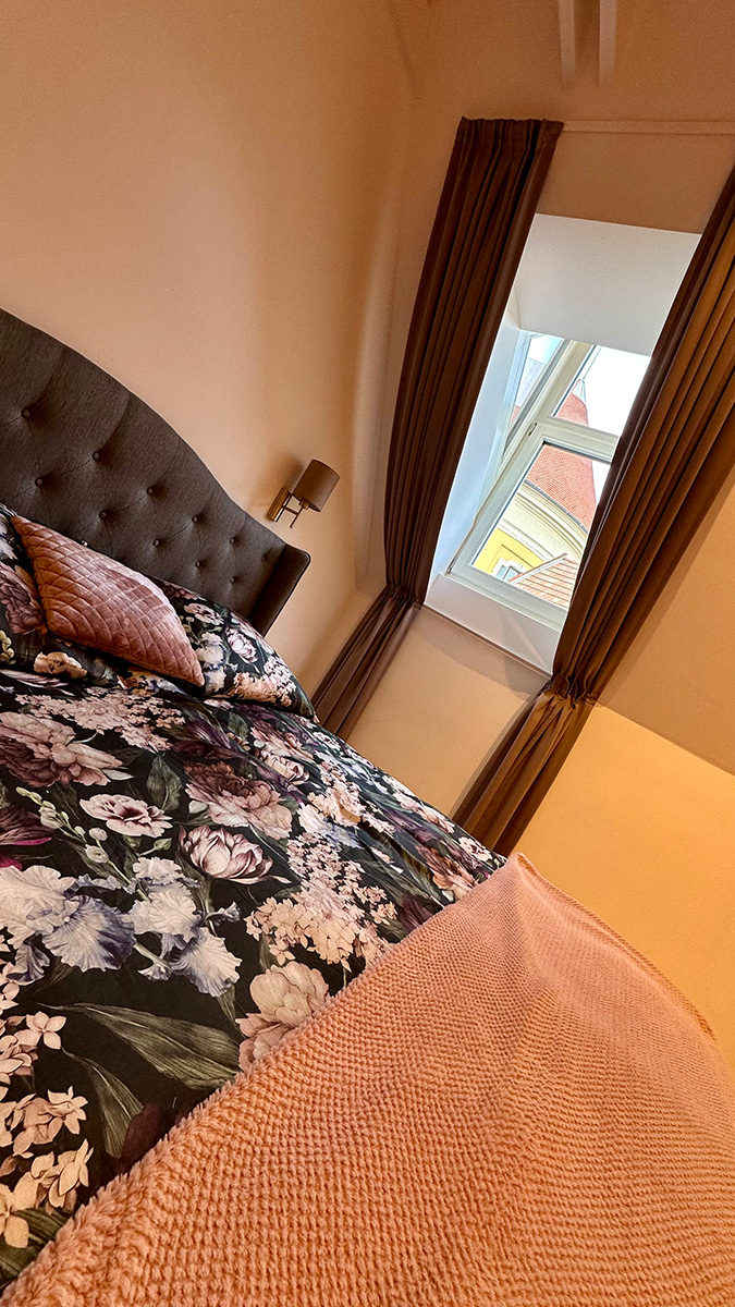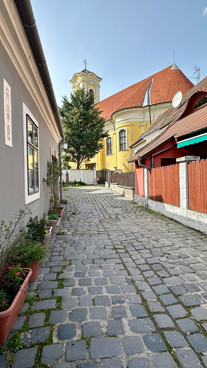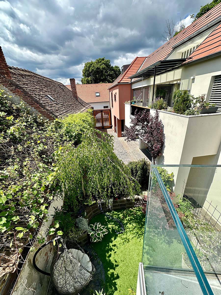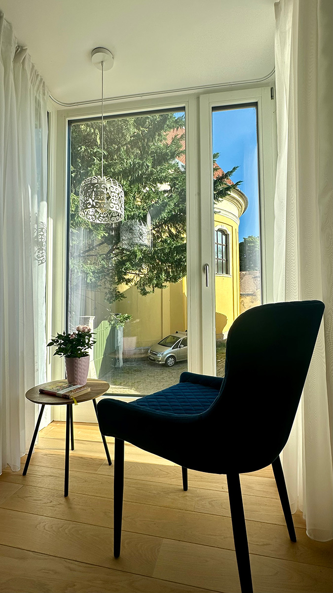 Ablakai az óváros macskaköves utcácskájára és a templomra, fedett terasza a belső kertre néz.