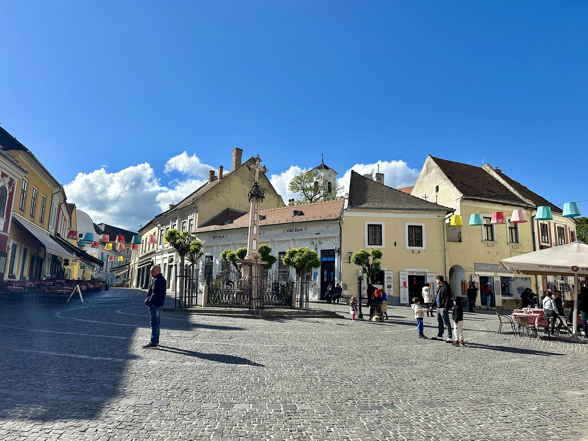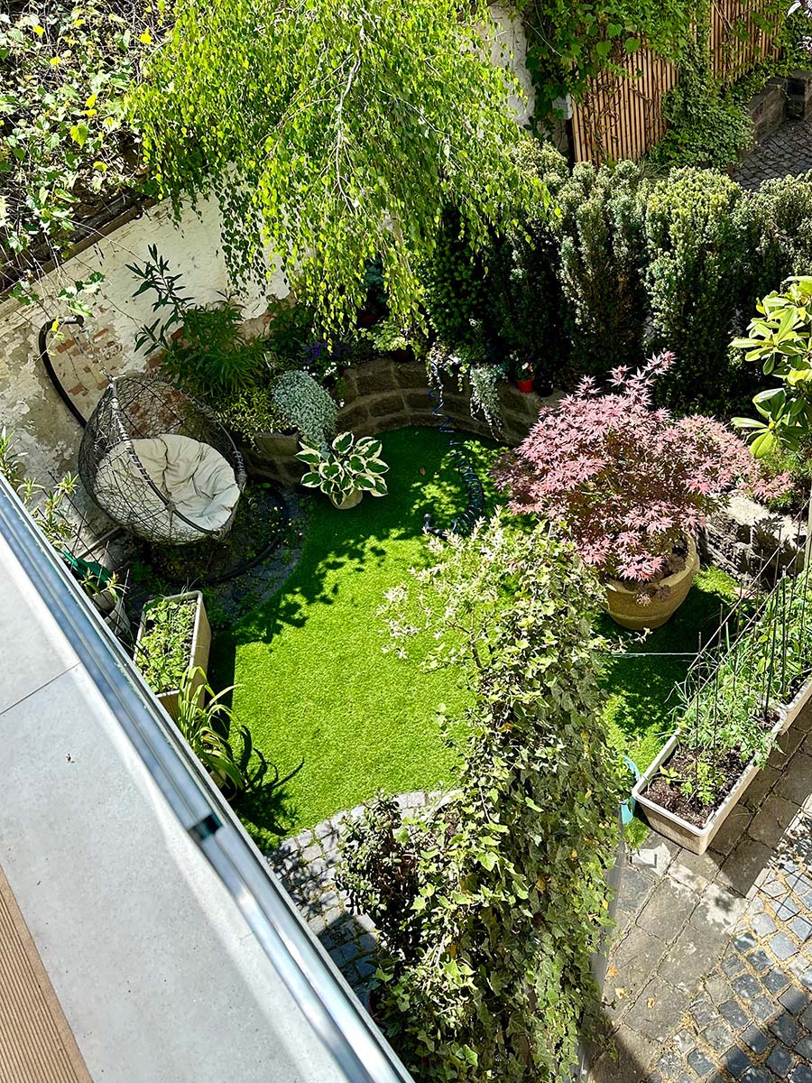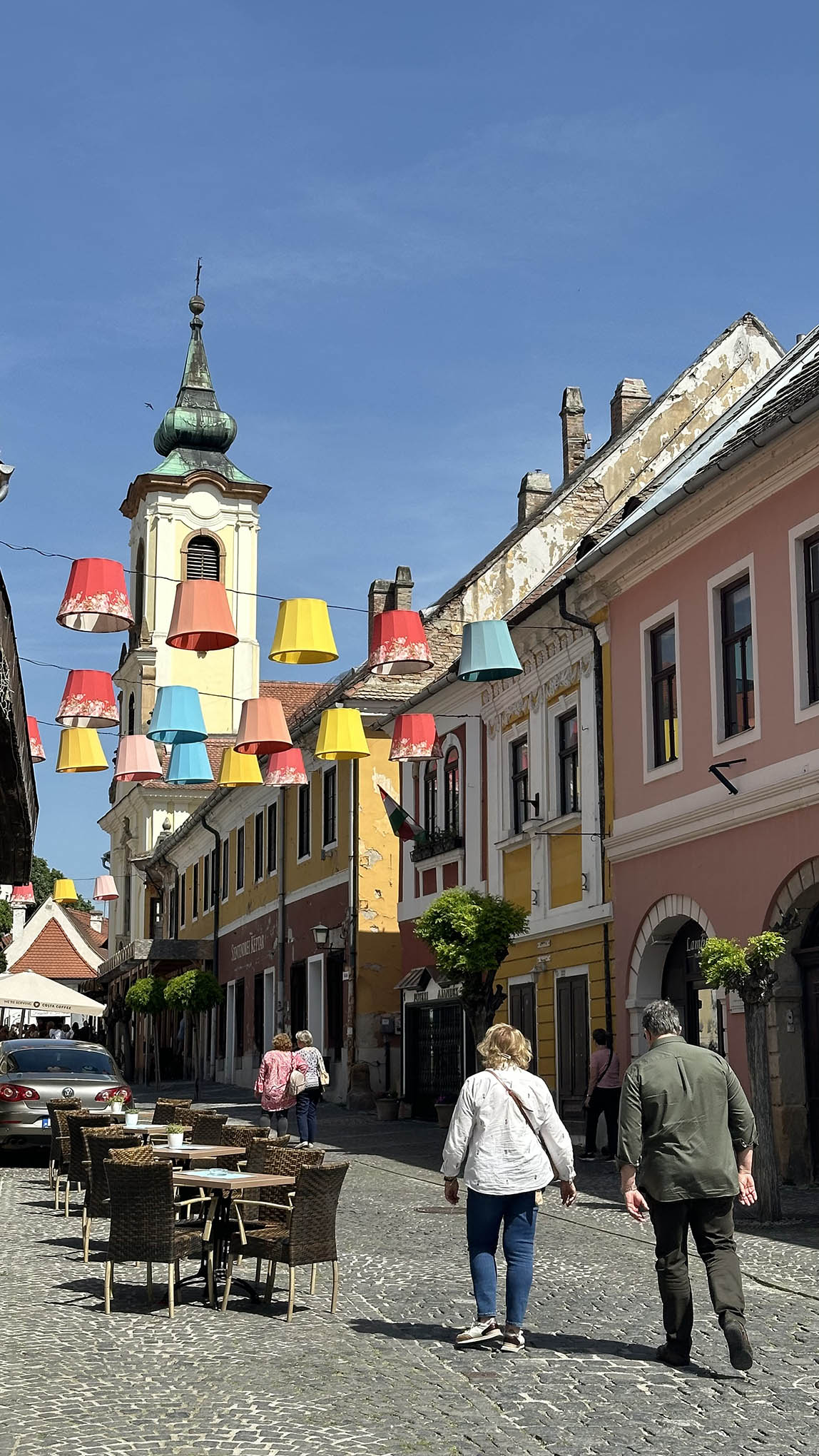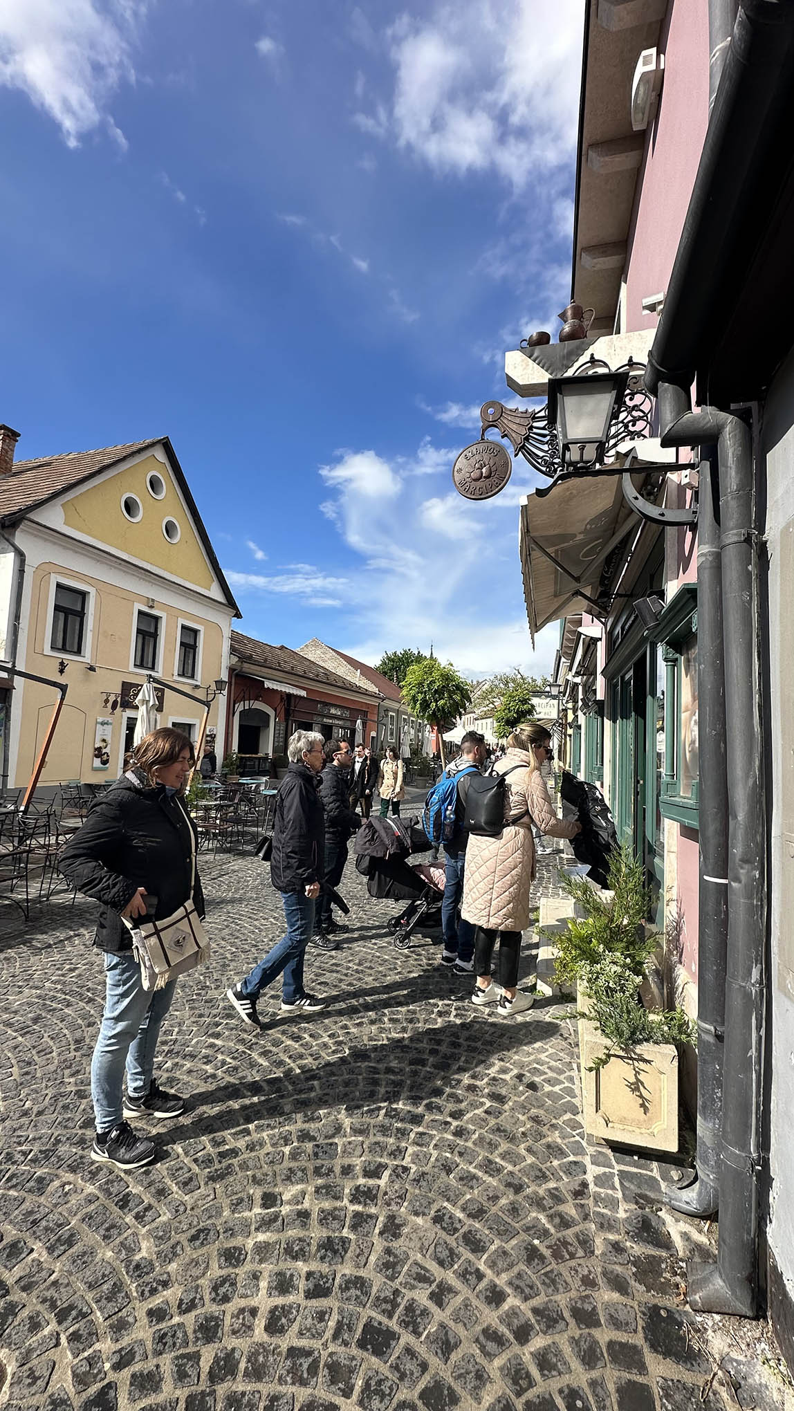 Ablakai az óváros macskaköves utcácskájára és a templomra, fedett terasza a belső kertre néz.