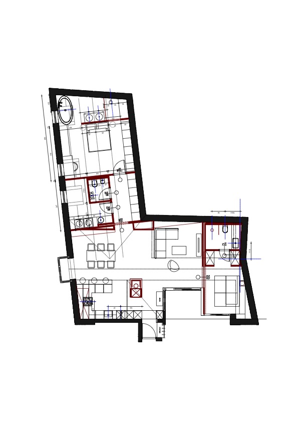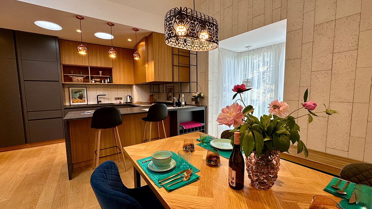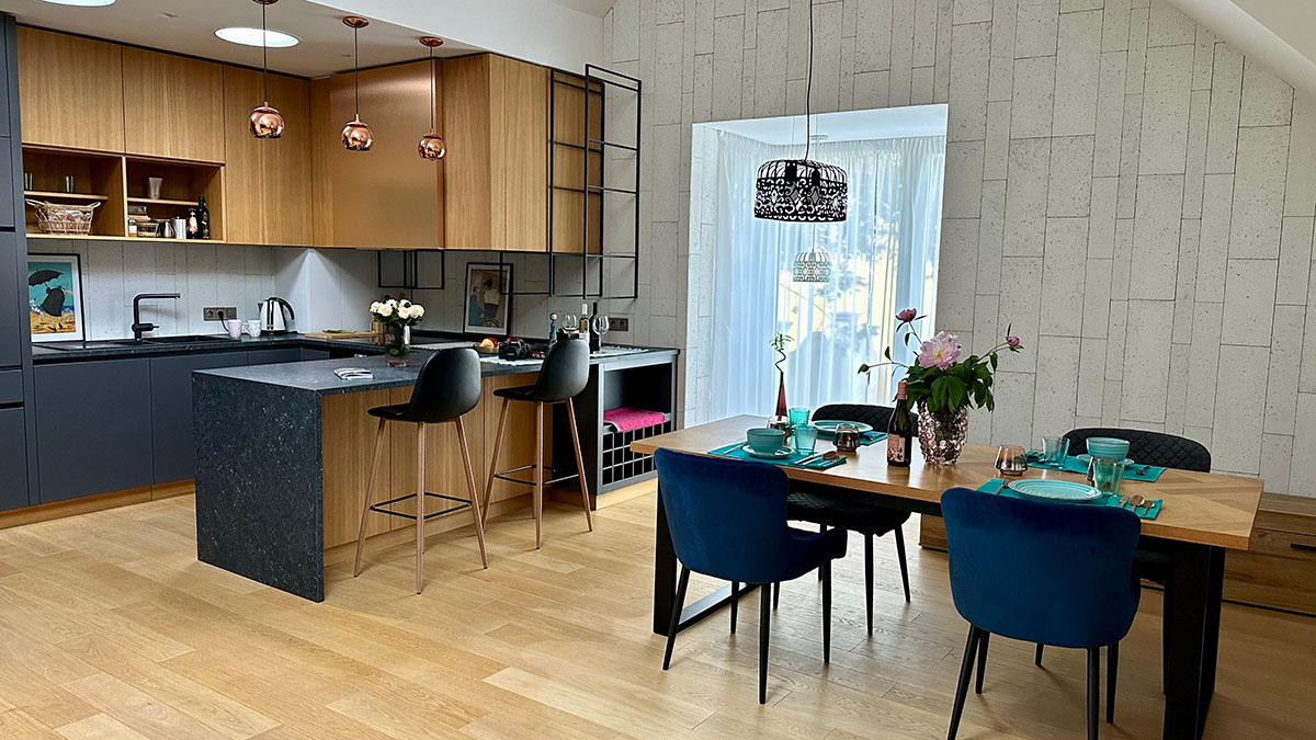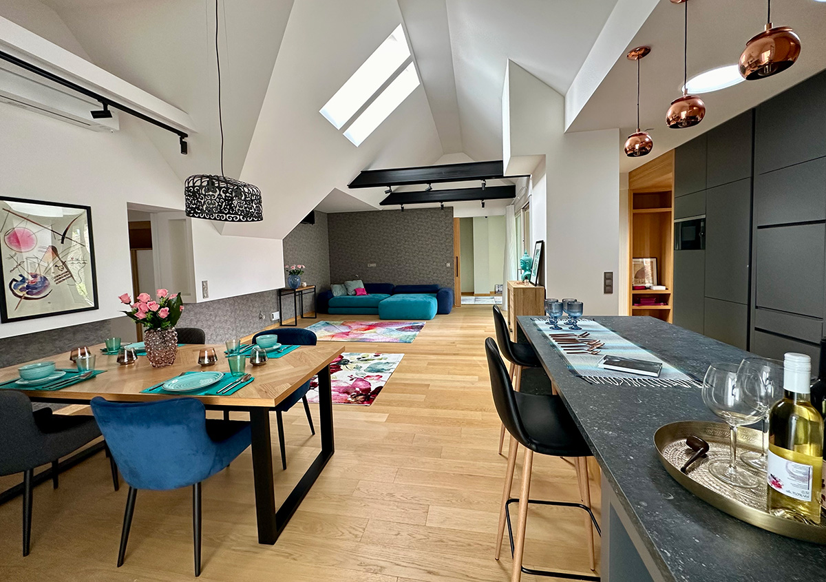 A nagy belmagasságú lakás központi tere az 56 négyzetméteres nappali és konyha-étkező. A két hálószoba és az azokhoz közvetlenül csatlakozó fürdőszobák a közlekedő két végén találhatók.