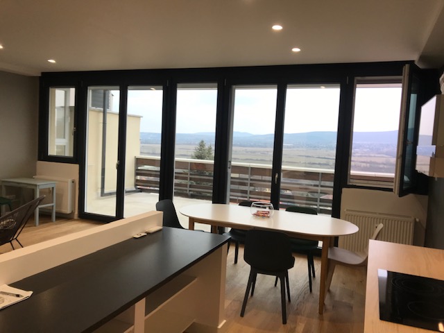 A nappalinál faltól falig (közel 7 méteres szélességben földtől plafonig "érő" ablakos ajtók kerültek elhelyezésre).