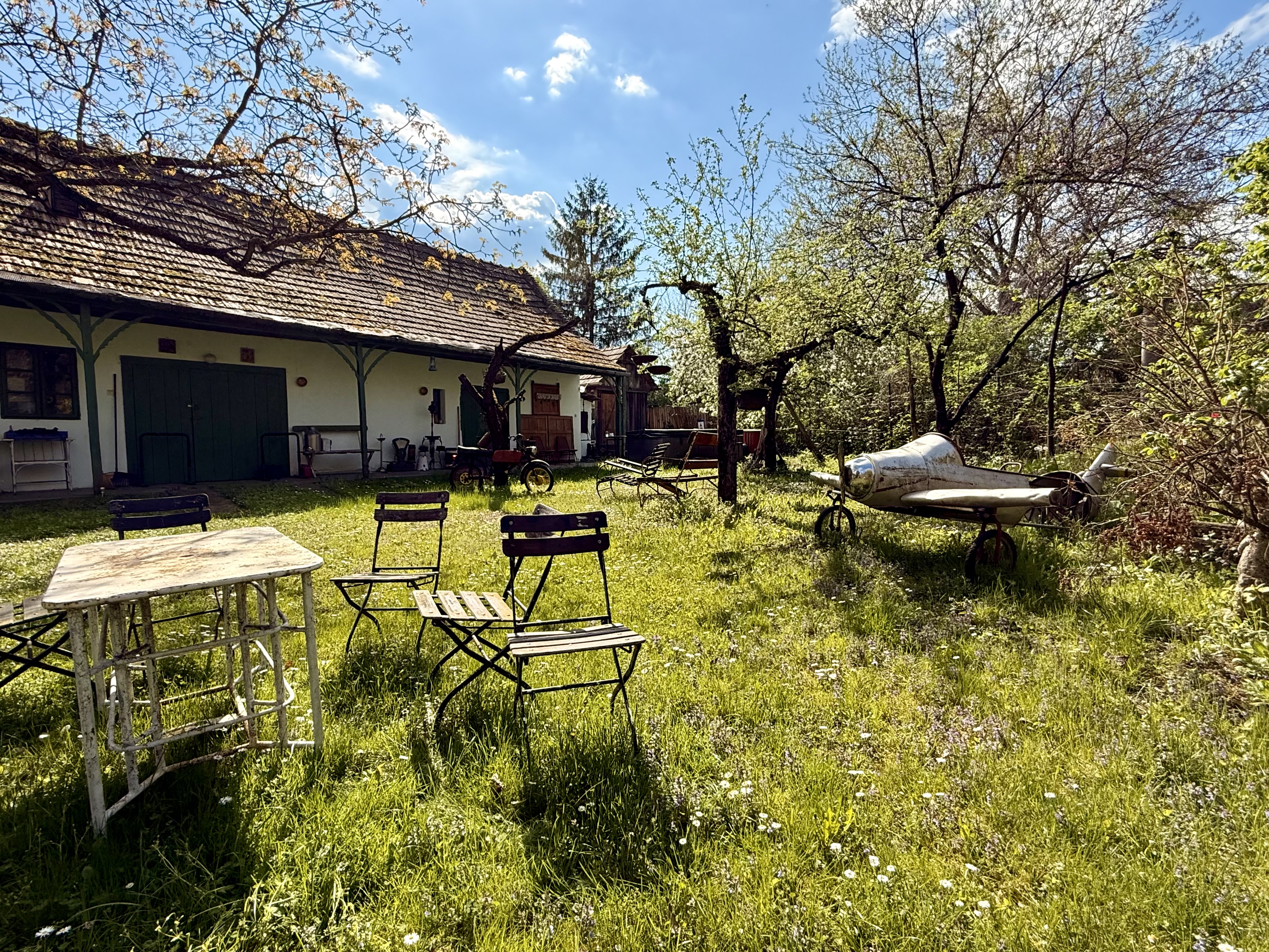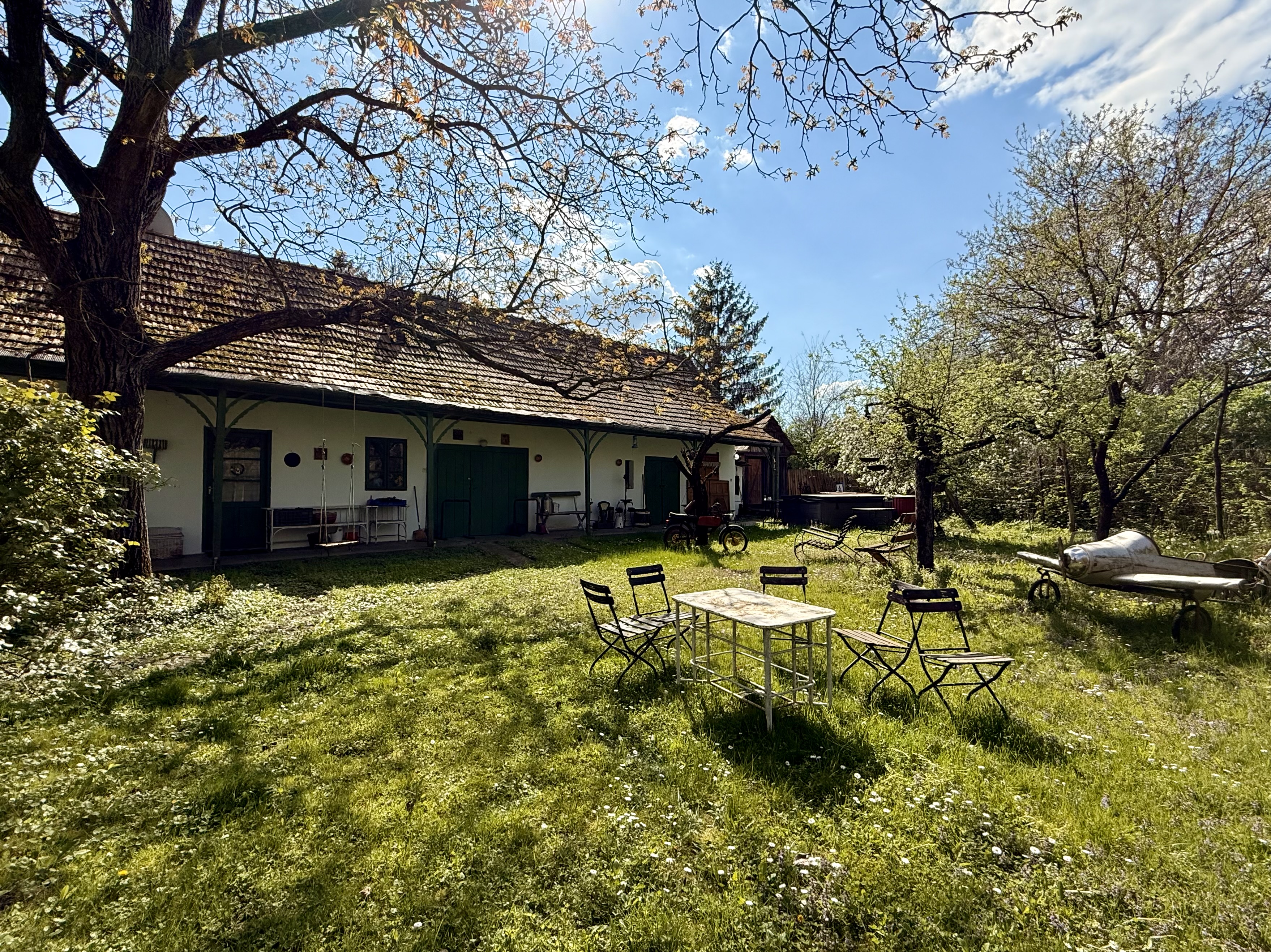 A kert sík, termő gyümölcsfákkal, szederrel, málnával. Intim, mivel nem látni be sem az utcáról, sem a szomszédok irányából. Kifejezetten vidéki idilli hangulatú. Megáll az idő, stresszmentese életet élhet aki ezt választja.